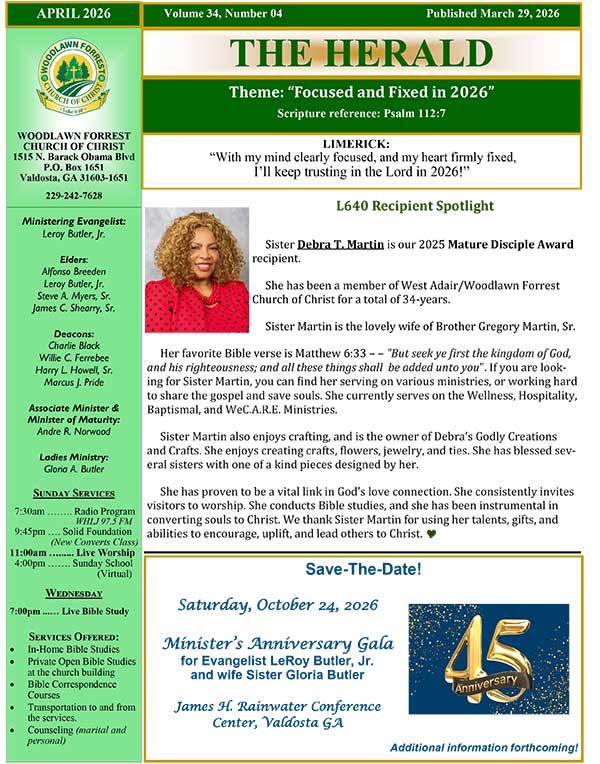 At the West Adair Church, he served as a deacon, bible school teacher coordinator, member of the finance committee, and bible school teacher. Bro. Shearry has also served as minister for the East Park Avenue Church of Christ in Hahira, Georgia, for fourteen months.